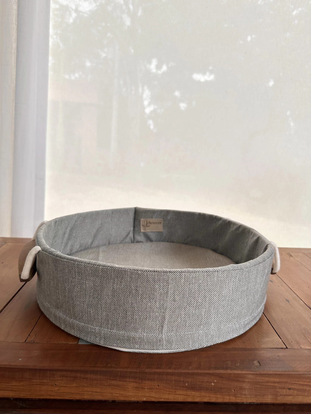| Material | Confeccionada com resíduo têxtil de alta qualidade; alças artesanais em madeira |