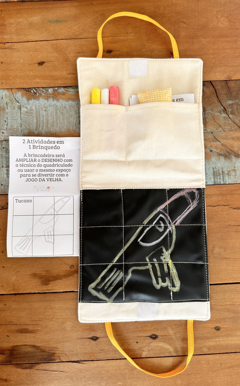 | Descrição | • Brinquedo educativo para ampliar desenhos usando a técnica do quadriculado • Acompanha almofadinha (apagador) feita com retalho colorido • Inclui 3 unidades de giz de quadro antialérgico • Feito em algodão cru, com fechamento em velcro e alças • Acompanha folheto com desenhos exclusivos de araucária e animais da floresta • Pode ser personalizado pela própria criança com lápis, giz de cera ou canetinha • Brinquedo 2 em 1 — também funciona como Jogo da Velha • Embalado em papel kraft reaproveitado, com almofadinhas feitas de retalhos • Produção sustentável: algodão cru sem tingimento e reaproveitamento têxtil |