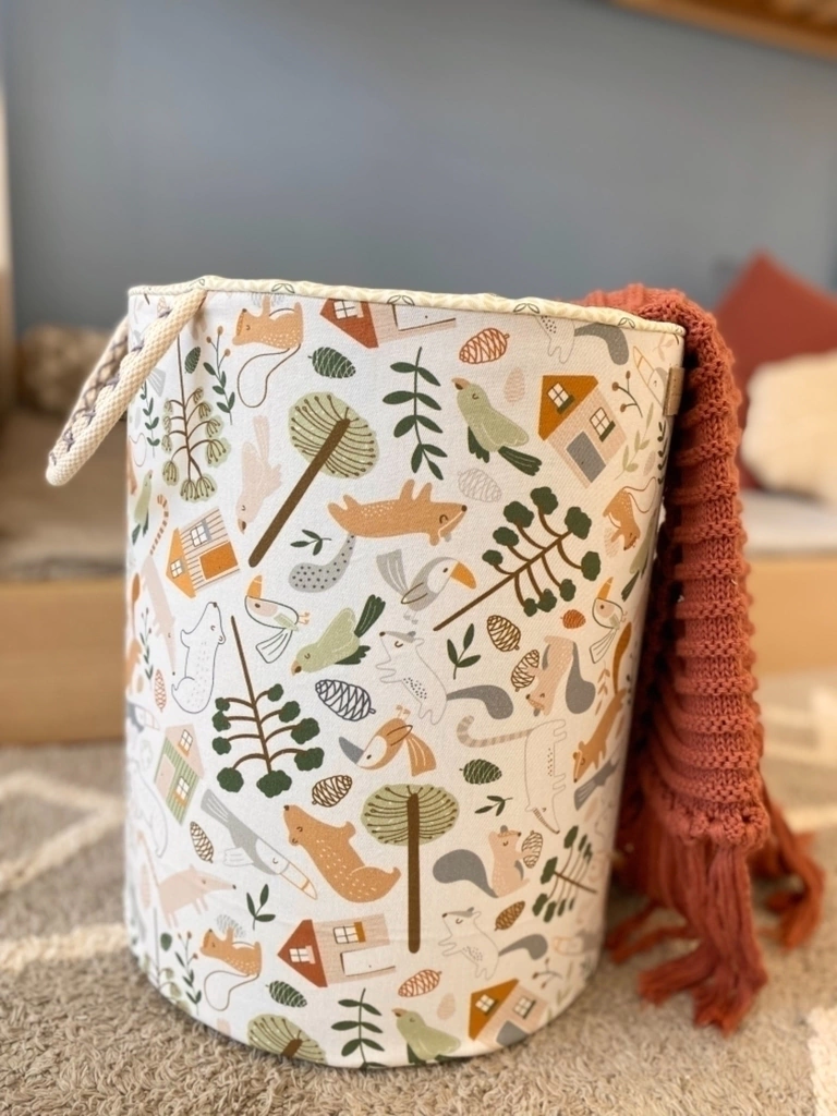 | Descrição | • Ideal para guardar brinquedos ou roupa suja no quartinho da criança • Feito em tecido 100% algodão da coleção exclusiva Retecer “Floresta das Araucárias” • Estampa Bosque: pinhas da floresta, época do pinhão e o esquilo como guardião das sementes • Duas alças em cordão cru com costura manual em ponto X • Zíper traseiro para retirada da placa estrutural • Fundo com placa que pode ser lavada junto ao tecido |