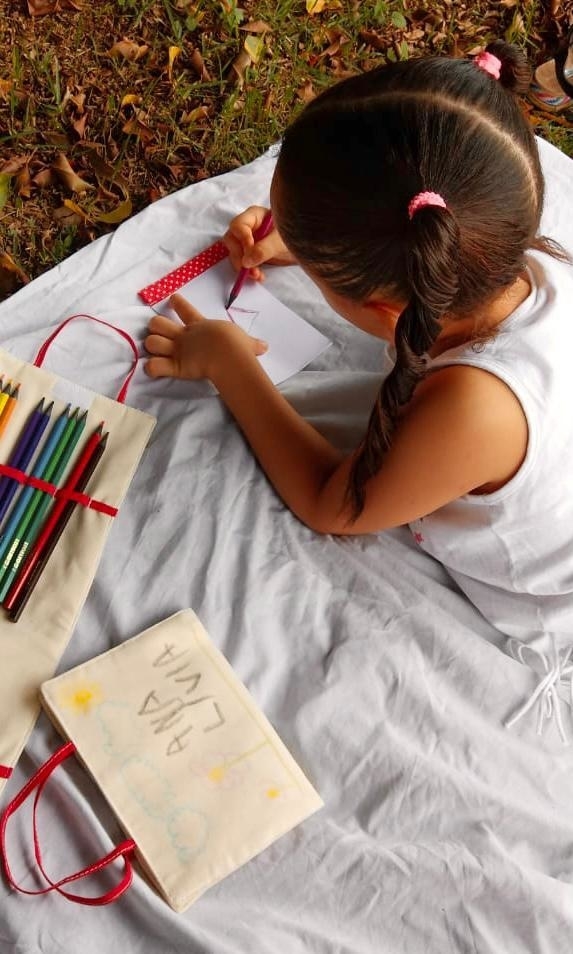 Quando a criança ganha um presente da BilaBiloca by Retecer ela recebe uma experiência única e especial, pois ela mesma poderá personalizar o seu estojo, usando o giz de cera para escrever o seu nome ou desenhar o que preferir no tecido de algodão cru.