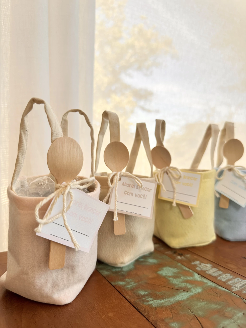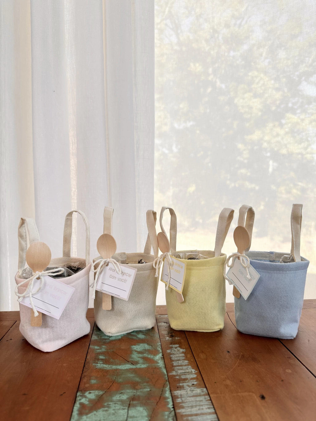 | Materiais | • Feltro para o vasinho • Retalhos de algodão nas alças • Composto orgânico Ciclo Limpo (100g) • Sementes de girassol • Colherzinha de bambu biodegradável |