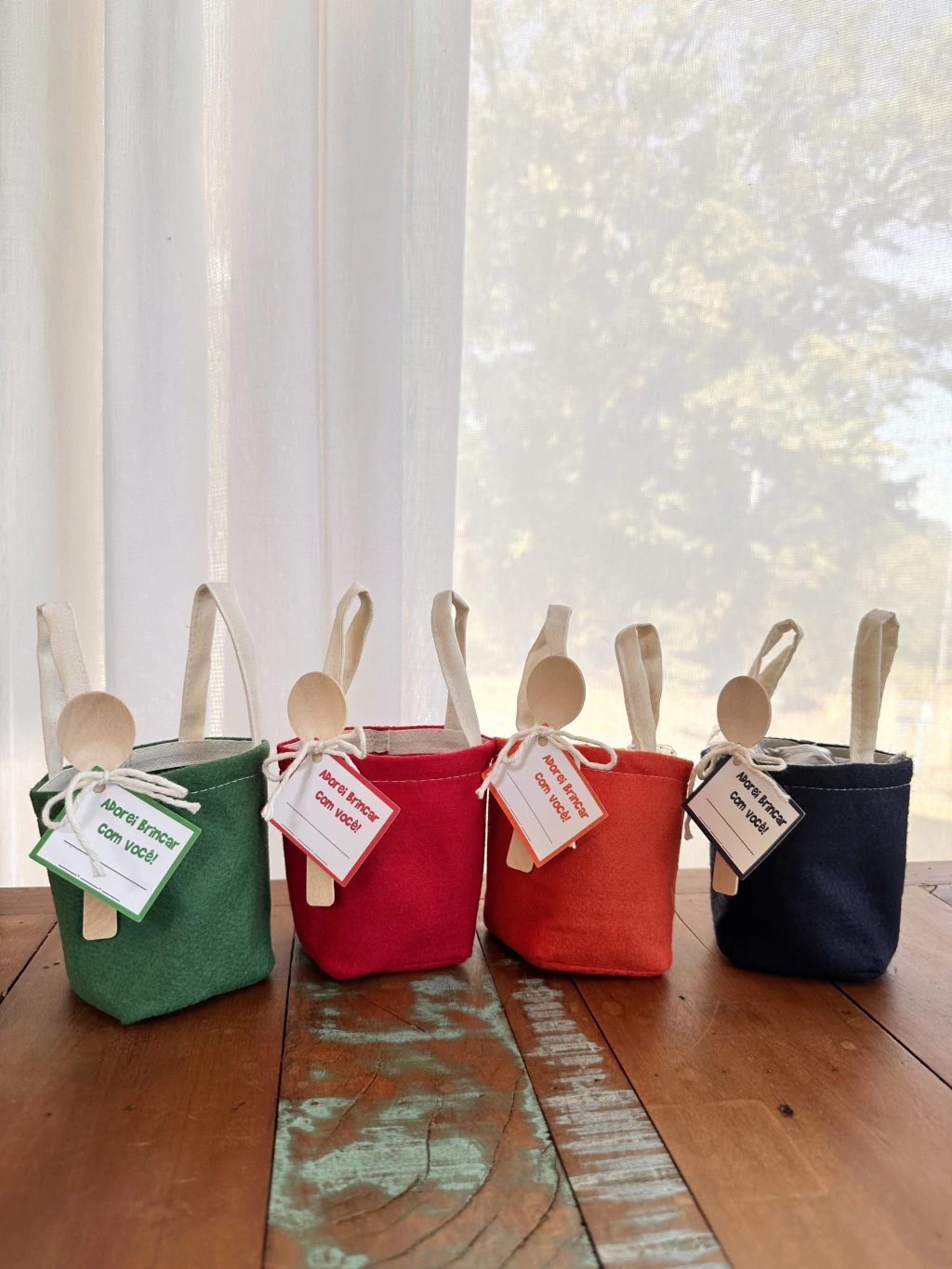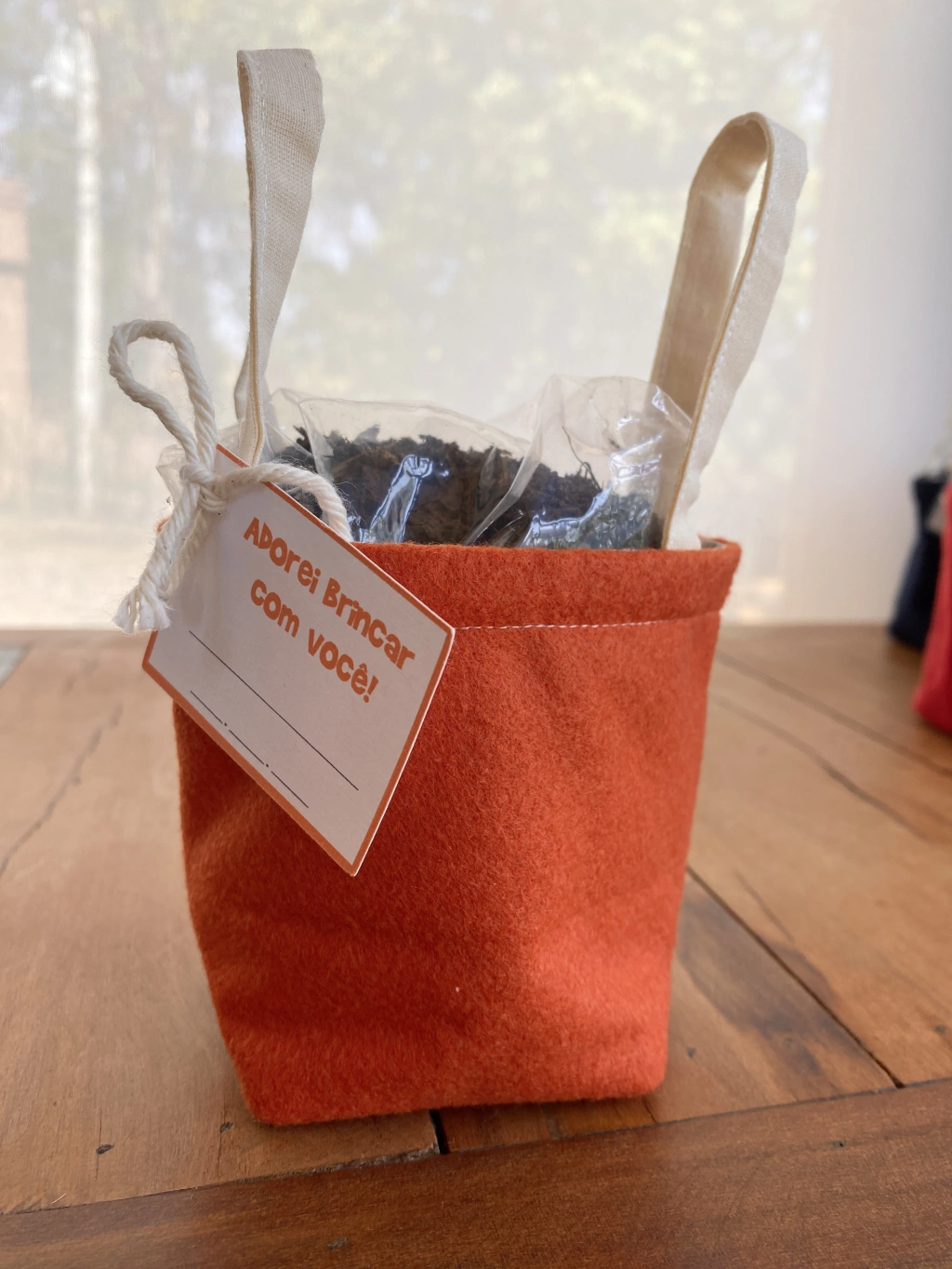 | Materiais | • Feltro para o vasinho • Retalhos de algodão cru para as alças • Composto orgânico Ciclo Limpo (100g) • Sementes de girassol • Colherzinha de bambu biodegradável |