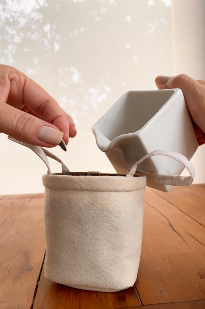 O Vasinho é feito em feltro, o que permite uma melhor oxigenação das raízes quando comparado aos vasos de plástico. As alças são feitas com retalhos de tecido algodão.