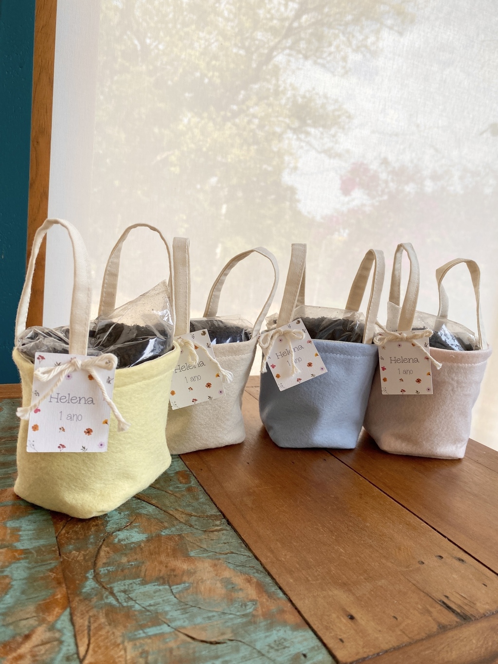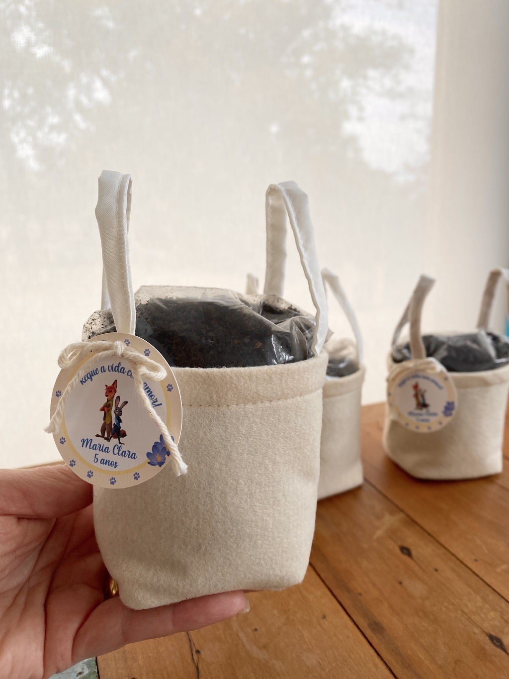 Enviamos os vasinhos separados dos sacos de composto para evitar que sujem. Sugerimos que você monte o kit, ou seja, coloque o saco com o composto dentro do vasinho, na véspera da festinha.