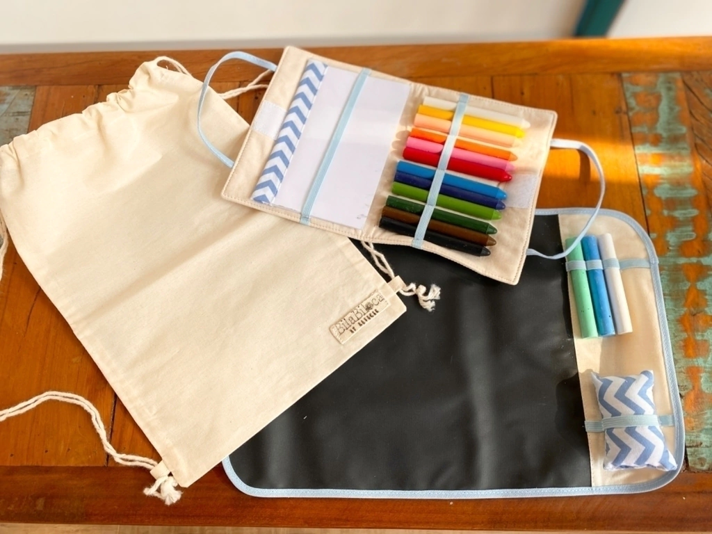 | Descrição | • Lousa com borda azul claro, acompanha almofadinha apagador e 3 gizes • Estojo com 12 gizes de cera e bloco com detalhe em tecido • Mochilinha em algodão cru para levar brinquedos, atividades ou roupas • Criança pode personalizar todos os itens com giz, lápis de cor ou canetinha • Valor unitário — preços especiais acima de 10 ou 30 unidades • Opção de tag personalizada (consultar) |