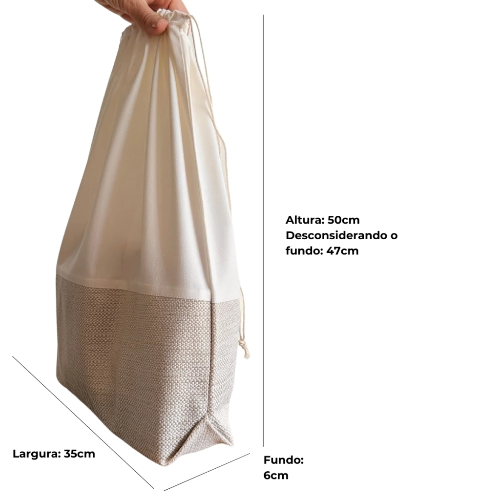 | Dimensões | • Necessaire P: 23 cm (L) × 8 cm (A) • Necessaire M: 23 cm (L) × 16 cm (A) • Saco M: 35 cm (L) × 50 cm (A) • Saco G: 42 cm (L) × 56 cm (A) |