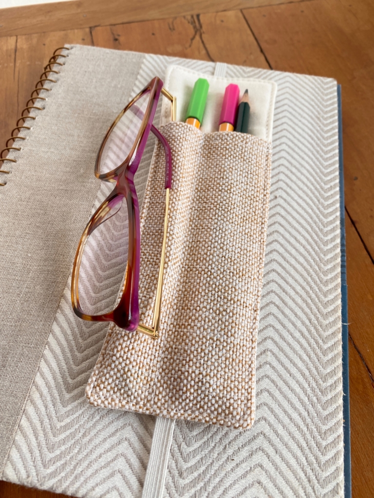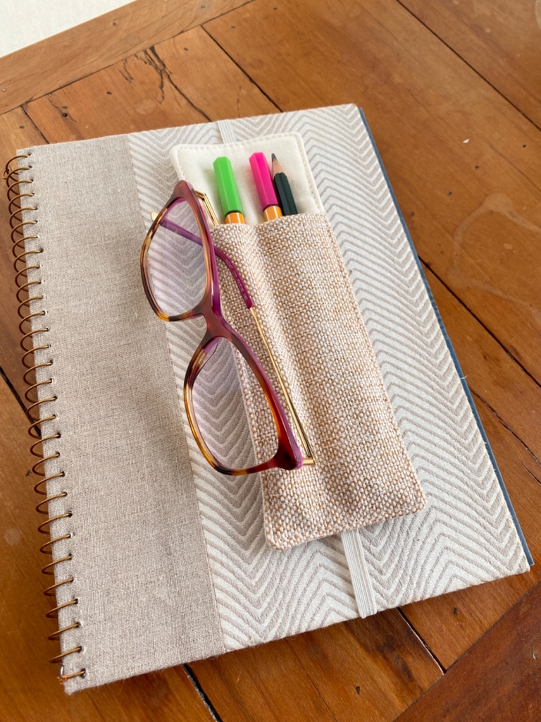 Para te acompanhar no momento leitura ou programar a semana. Com espaços para caneta, lápis e até óculos.