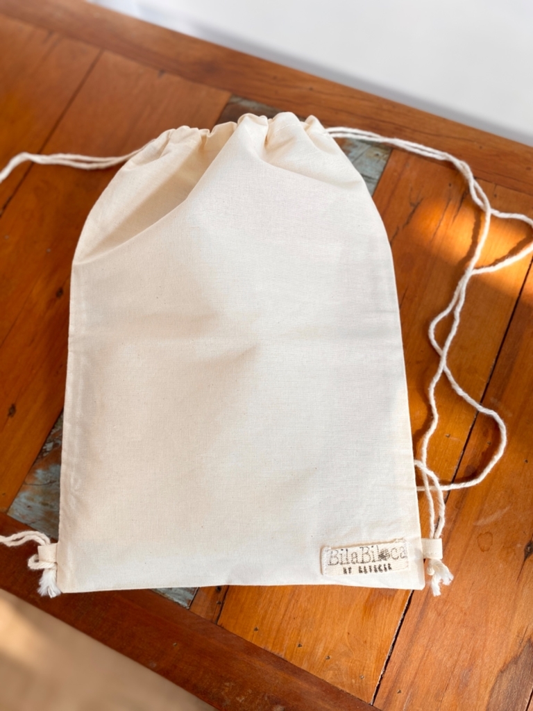 Mochilinha em tecido de algodão cru para carregar brinquedos, uma troca de roupa ou mesmo atividades escolares.