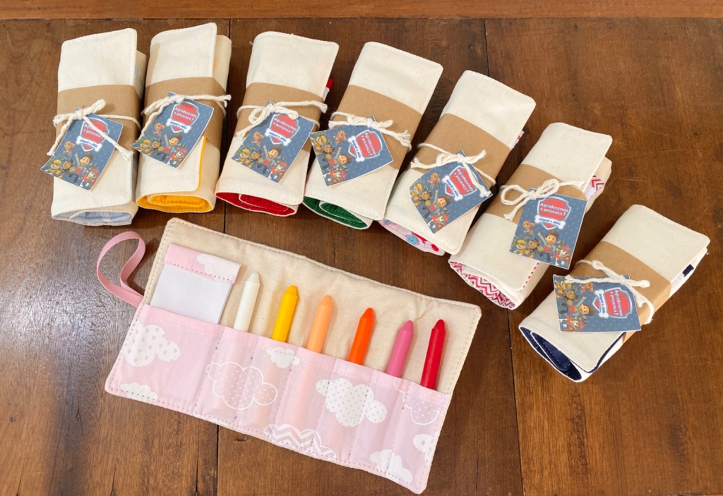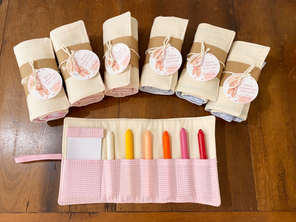 Rolinho em tecido de algodão cru contendo 6 unidades de giz de cera e um bloquinho de papel . É fechado facilmente com elástico.